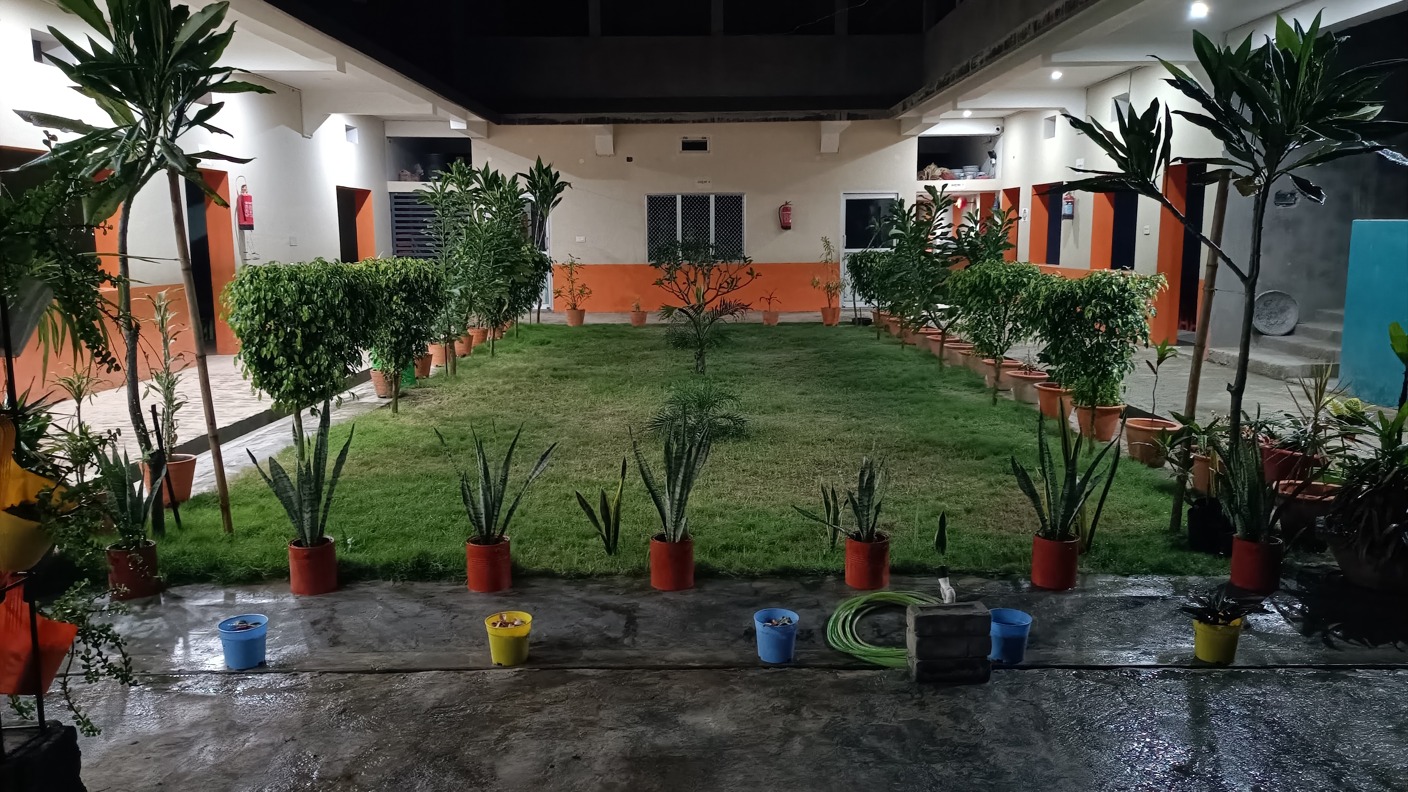 A front view of the campus captured in a photo, with all students standing.