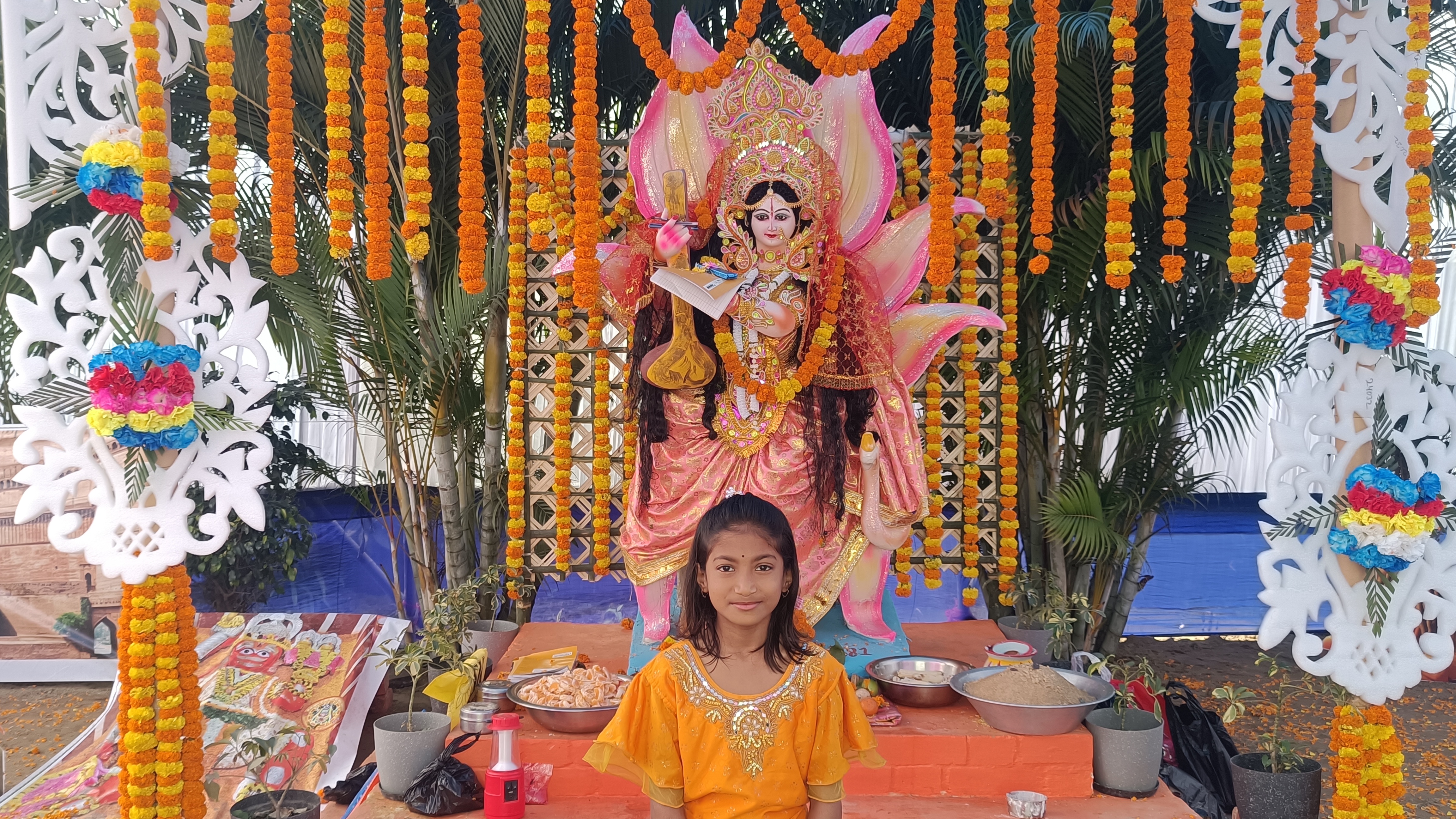 A sacred moment captured during Saraswati Puja, seeking blessings from Maa Saraswati for wisdom, knowledge, and success..