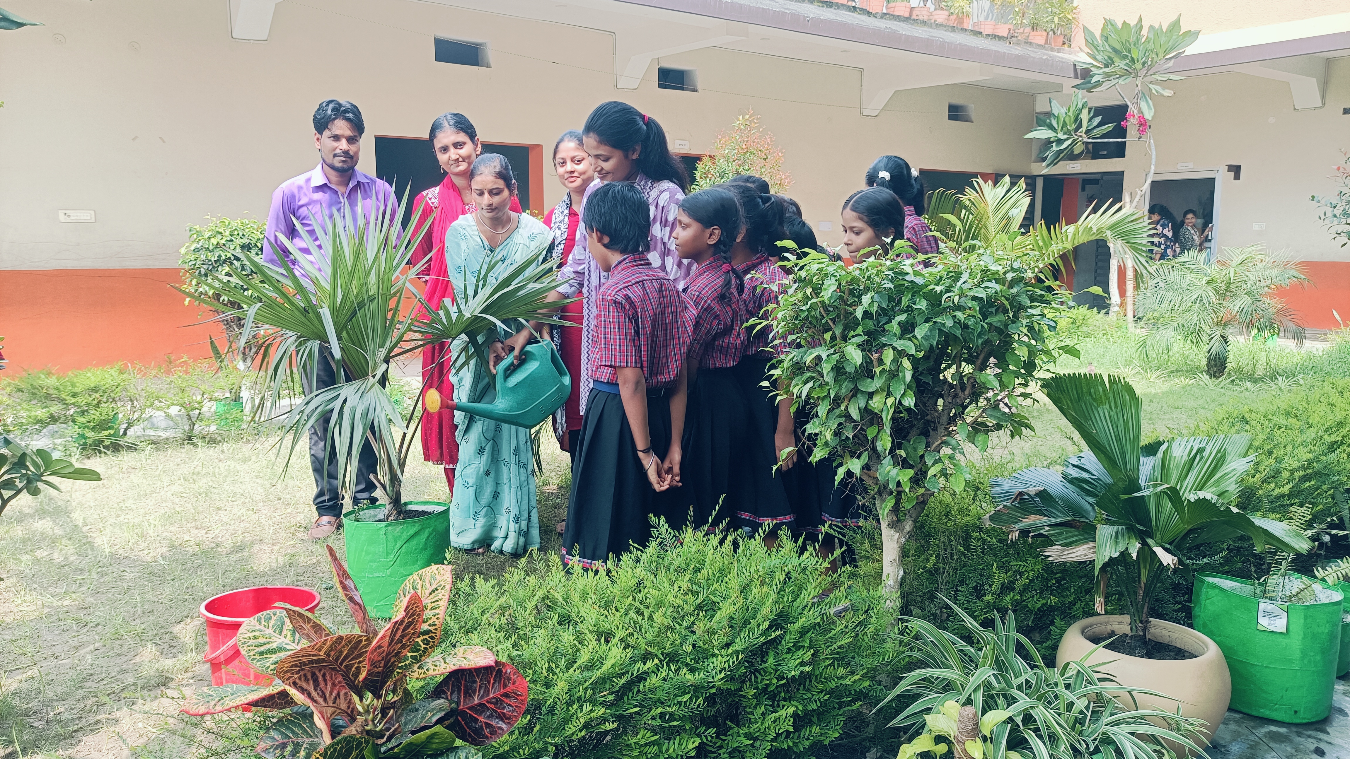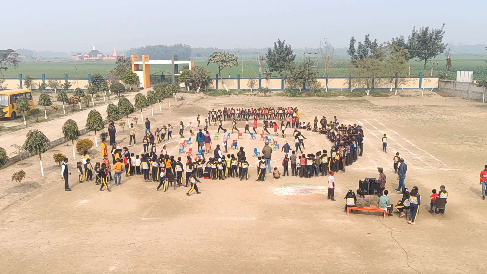 A front view of the campus captured in a photo, with all students standing.